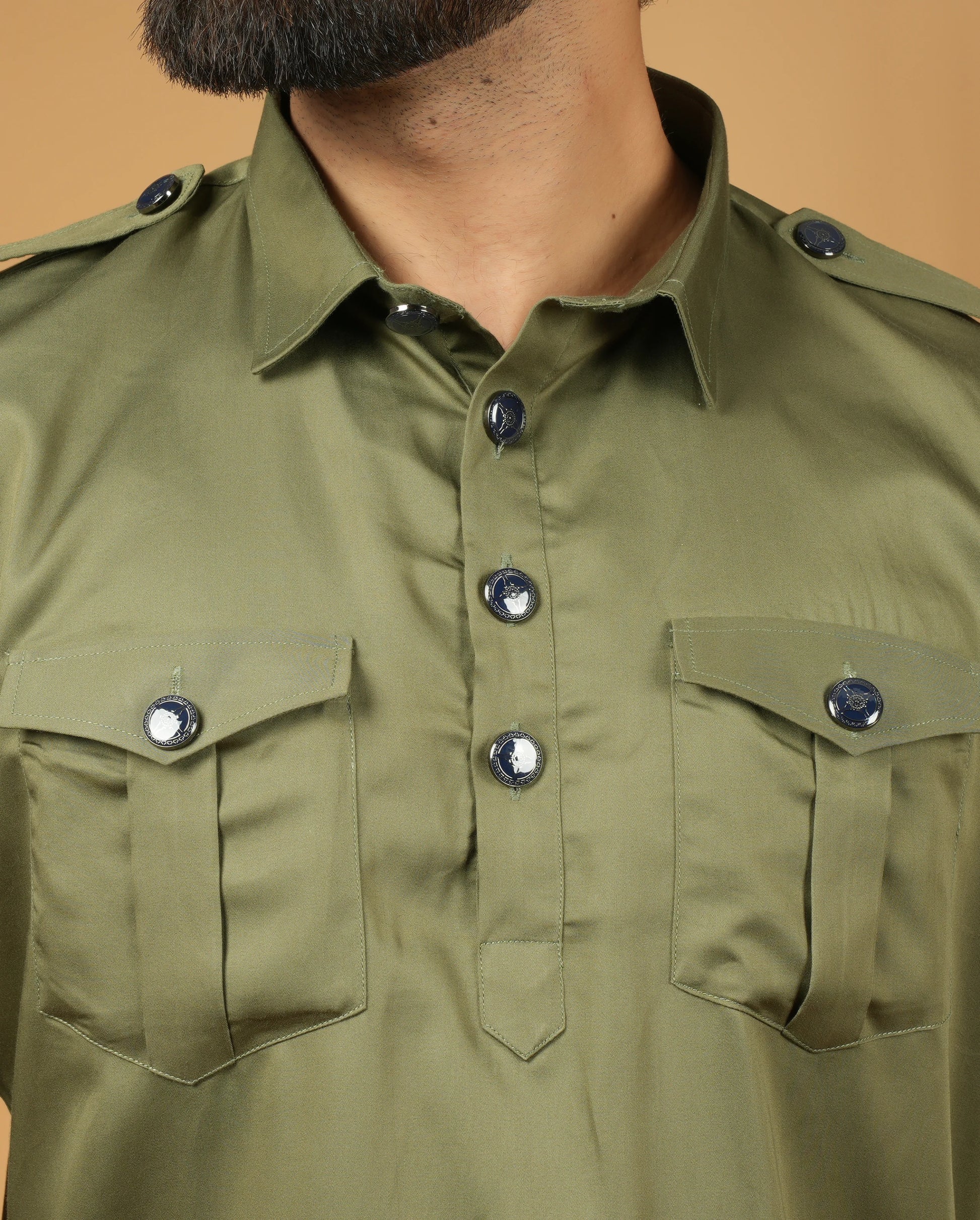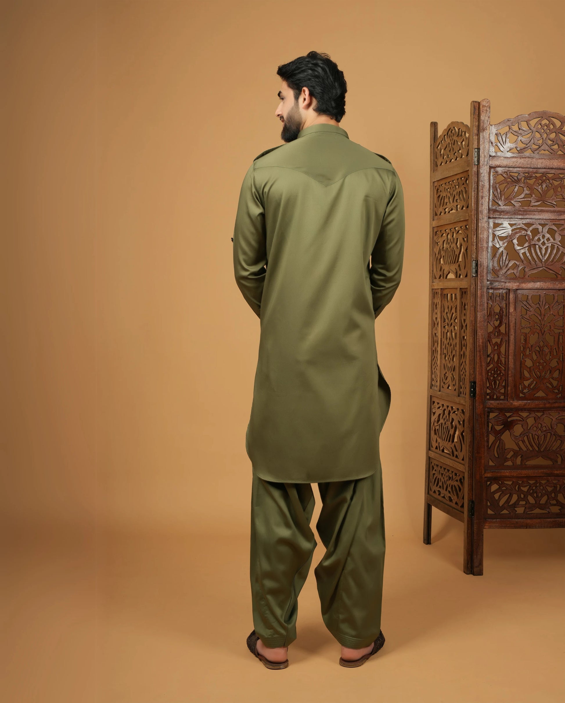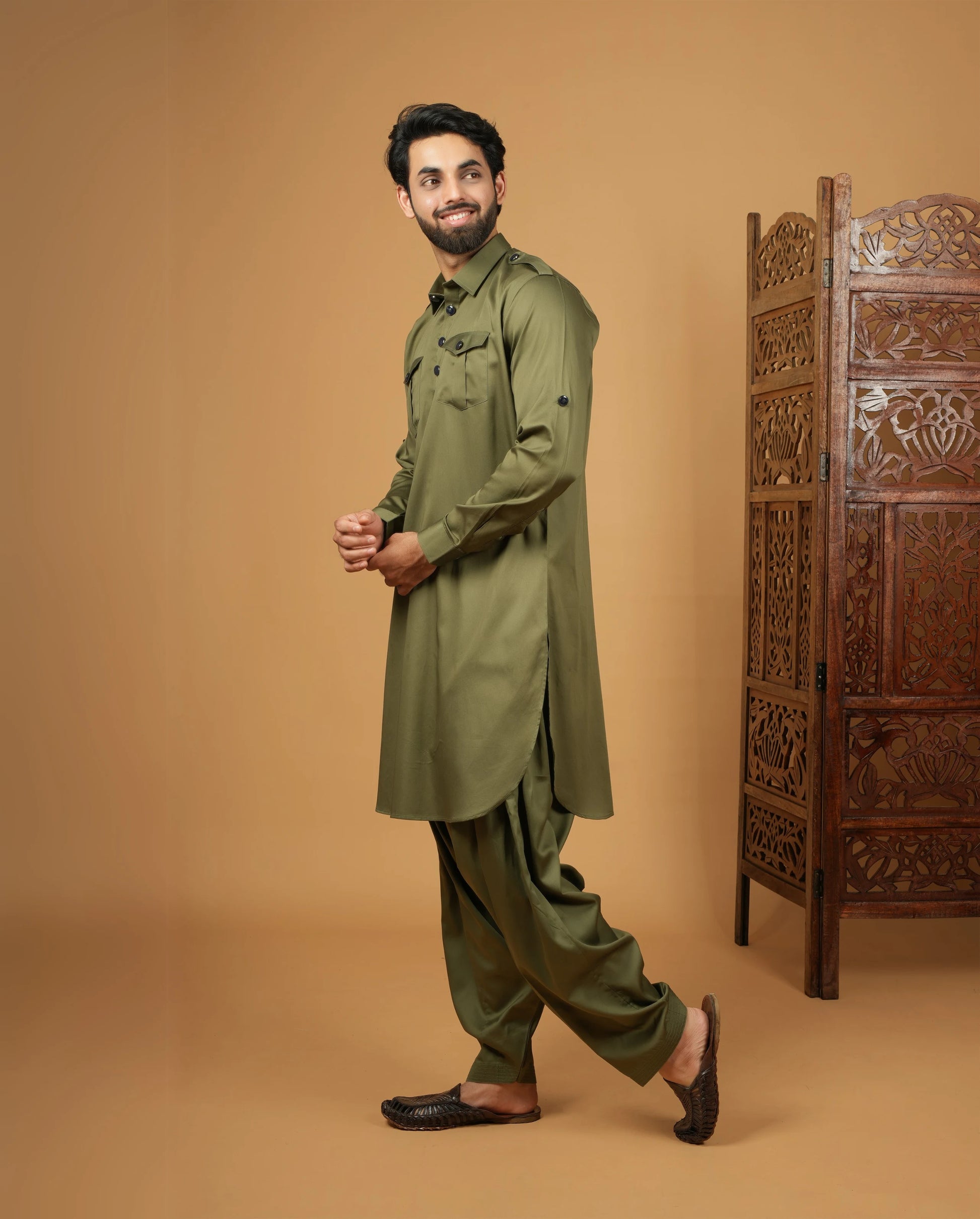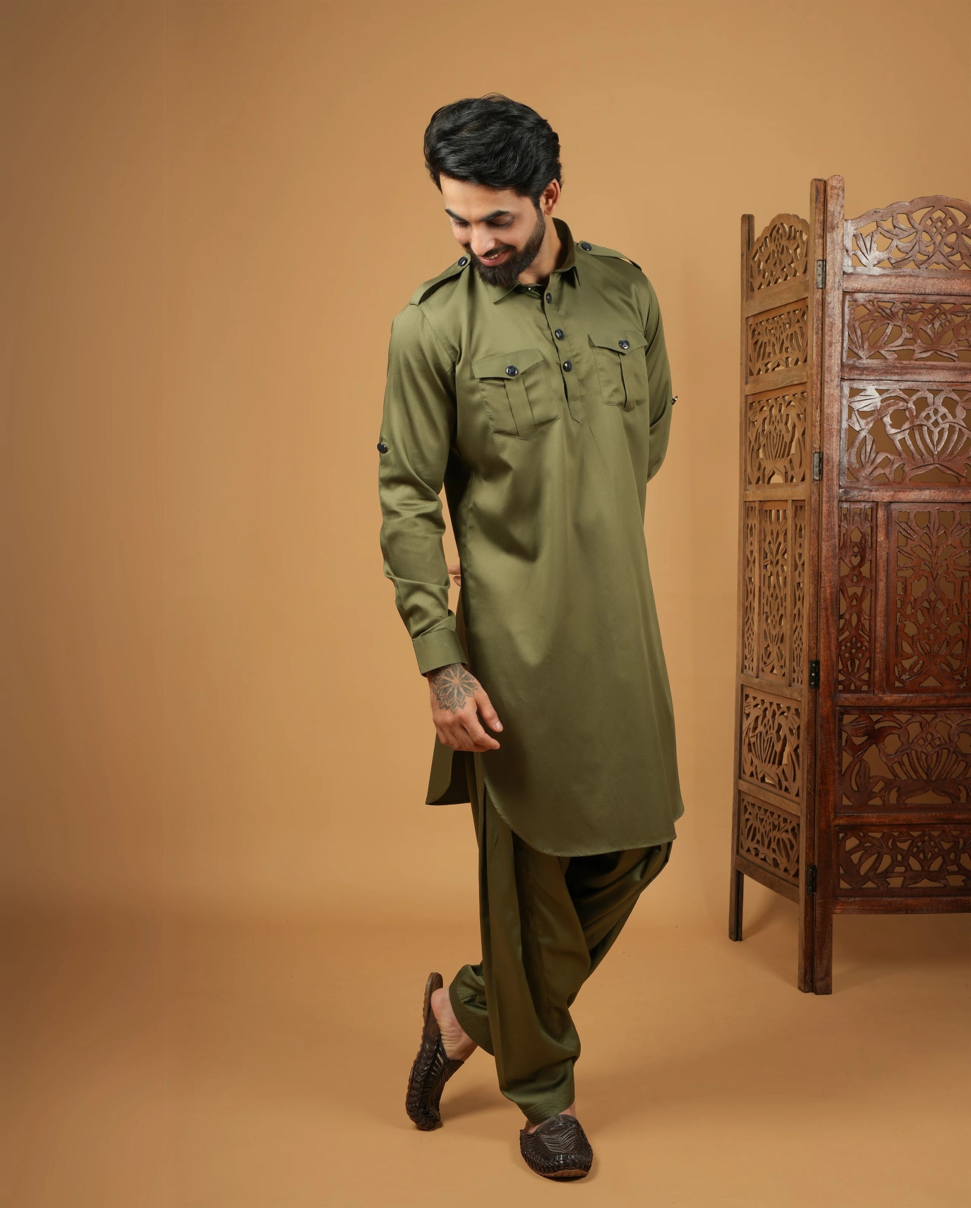 Men’s Ethnic Light Olive Pathani Kurta Set with Pockets