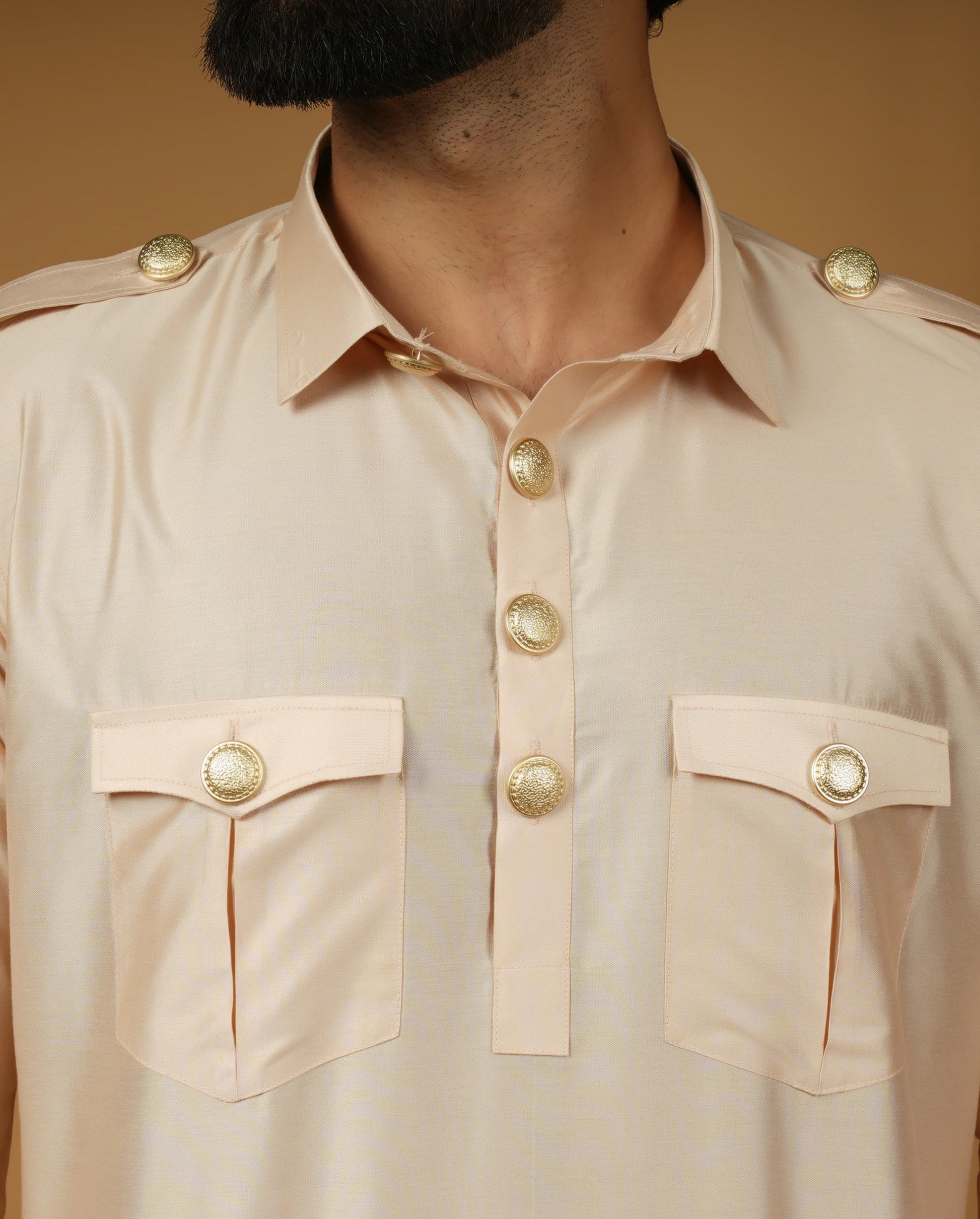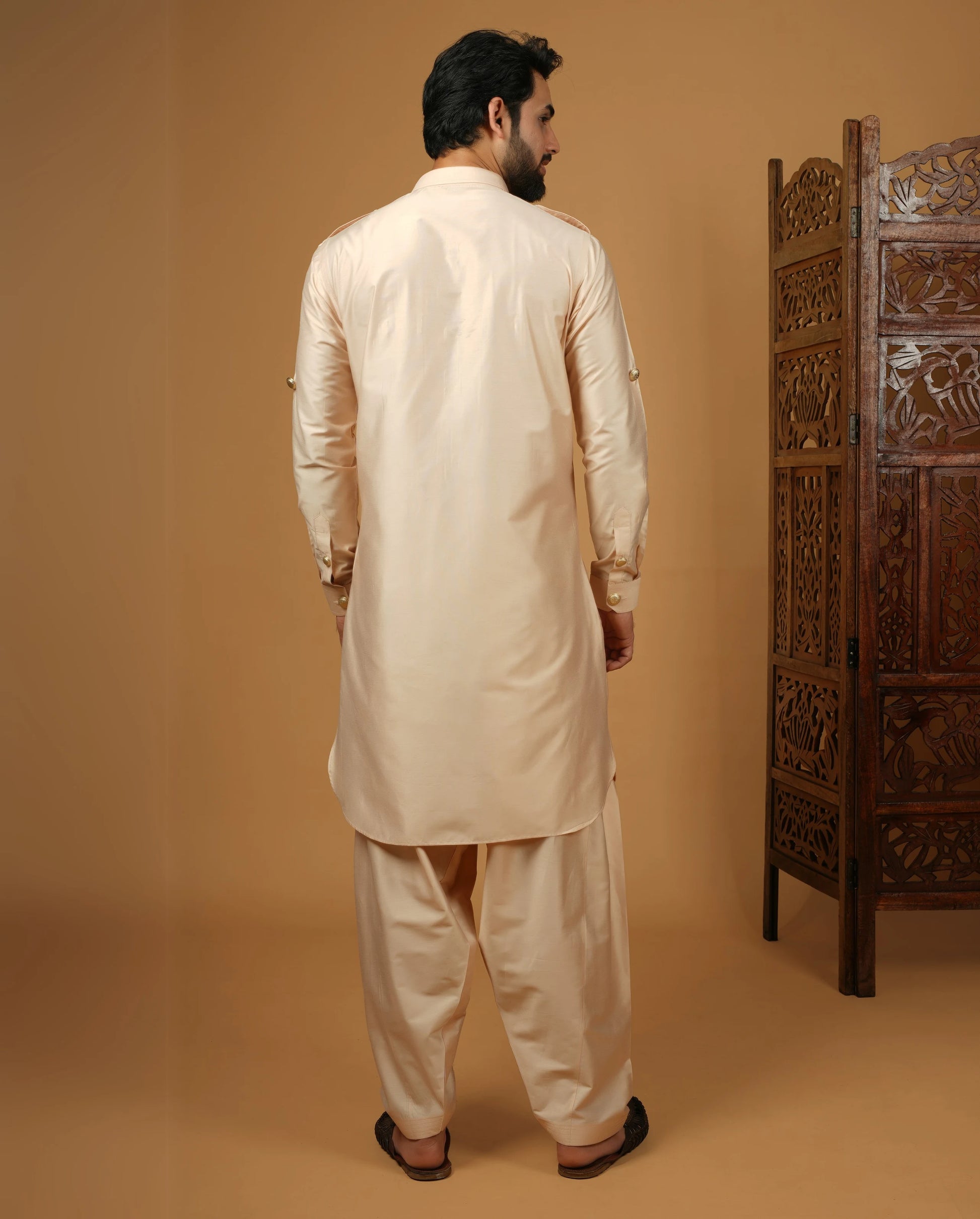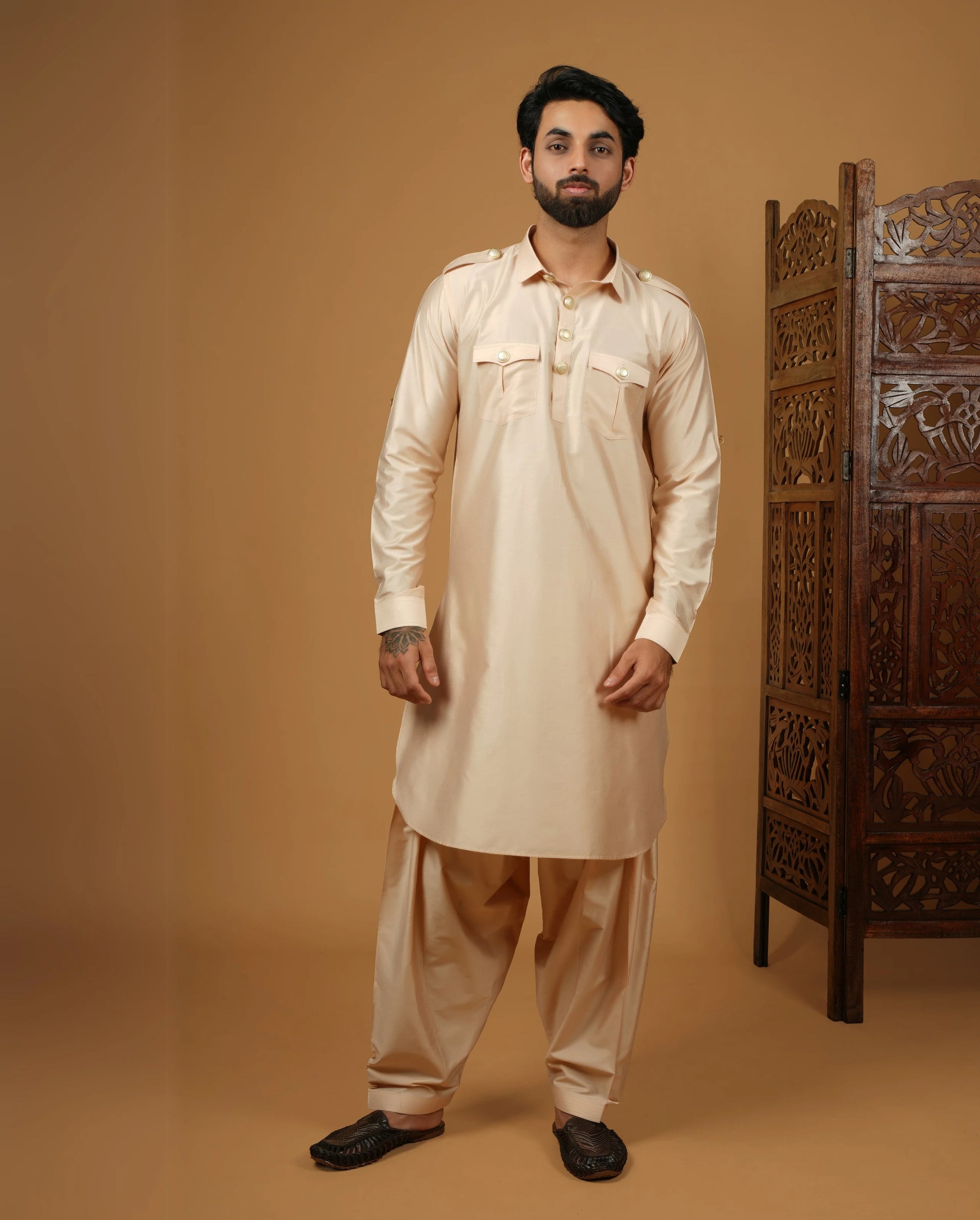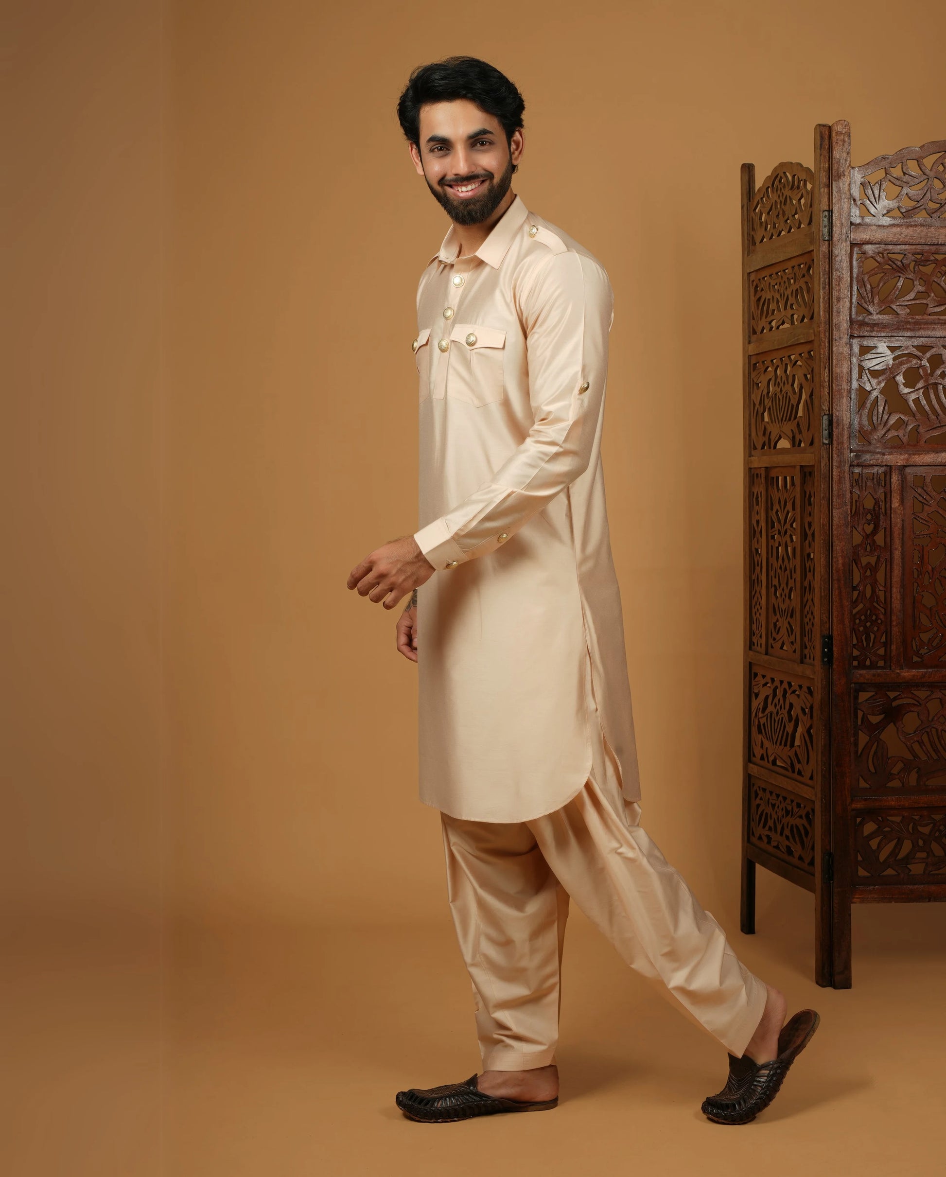 Men’s Ethnic Peach Pathani Kurta Set with Pockets