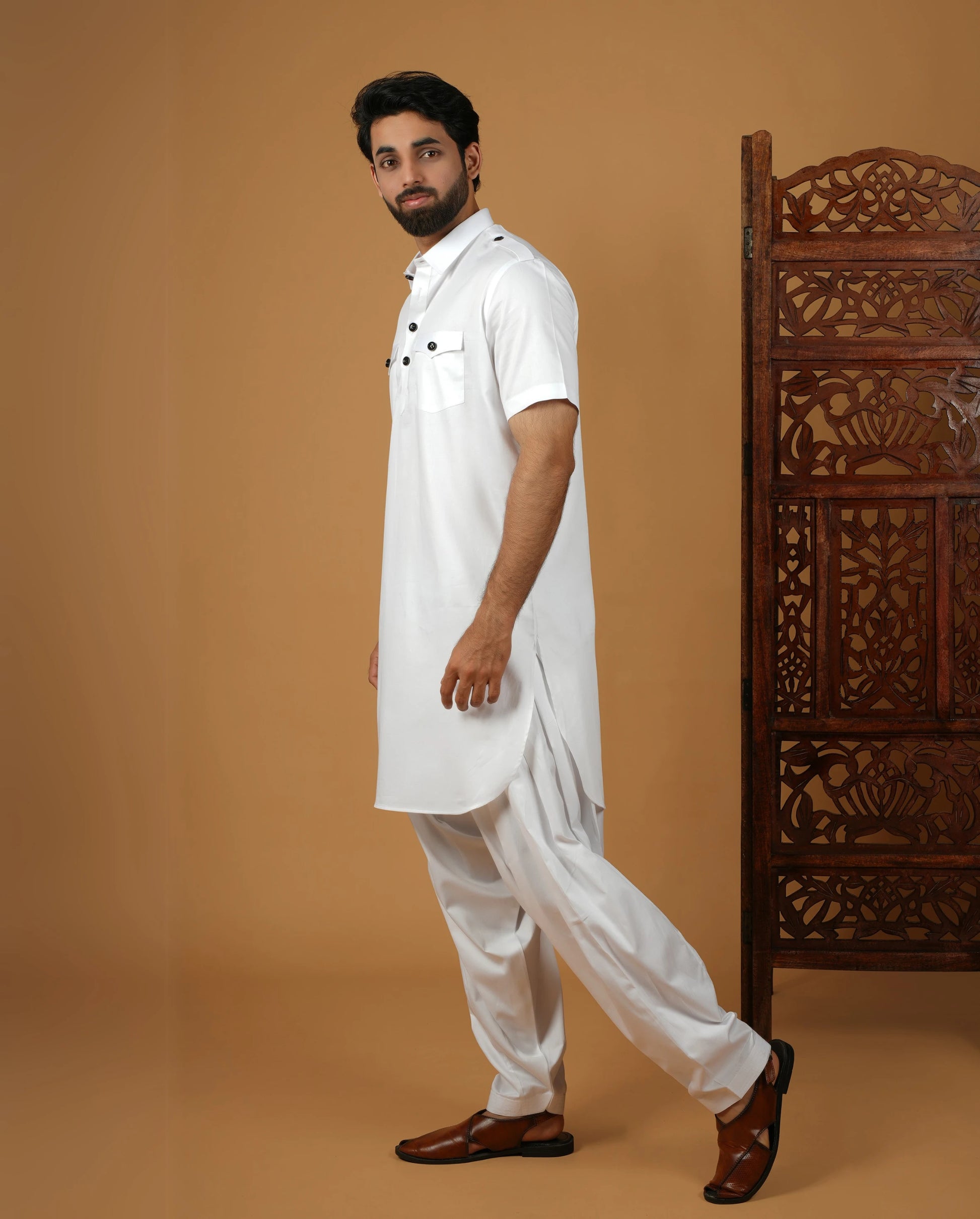 Designed with a Mandarin collar, Short sleeves, and flap chest pockets, this Pathani-style kurta features a straight hem and side slits for comfort and ease of movement. Whether you're dressing for a cultural function or aiming for a stylish Indo-Western look, this kurta delivers on both fashion and function.