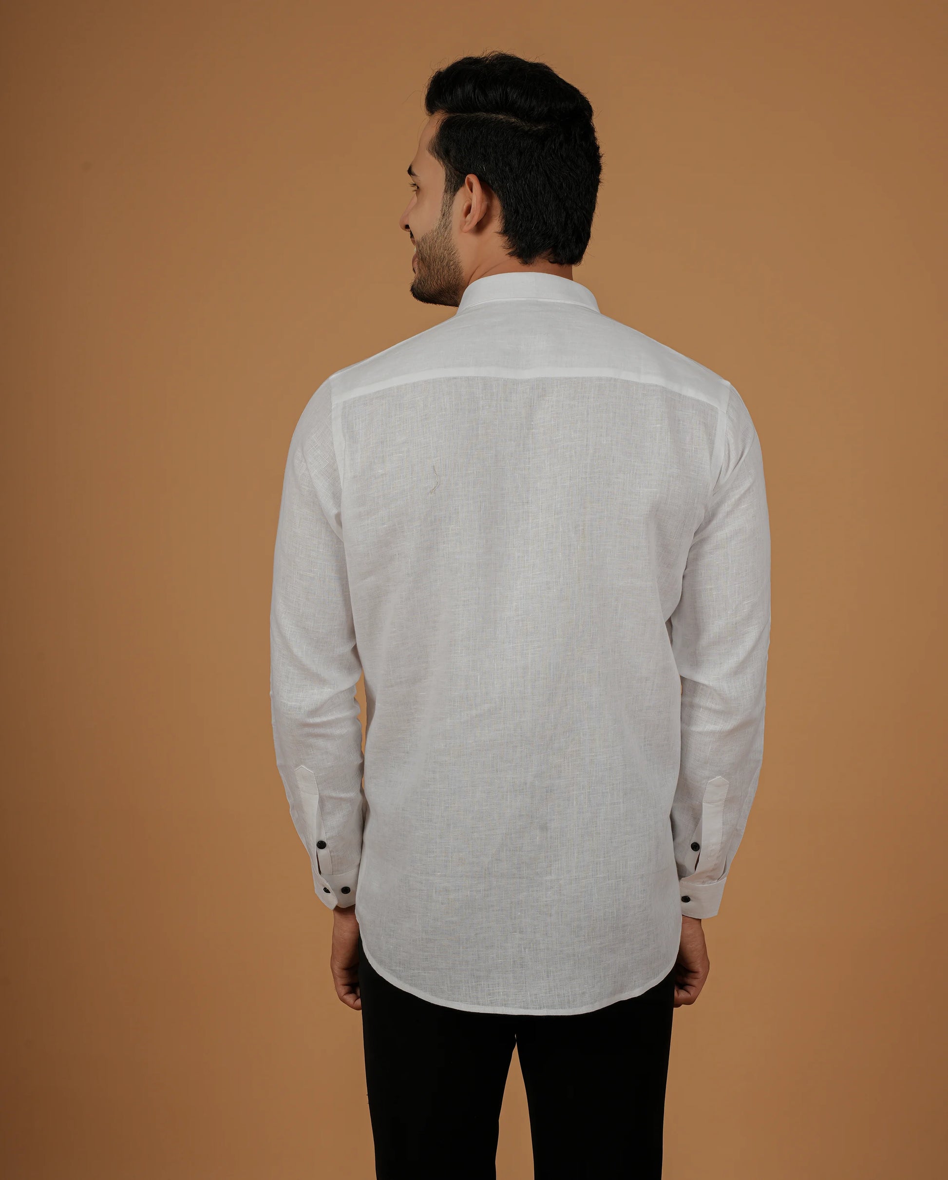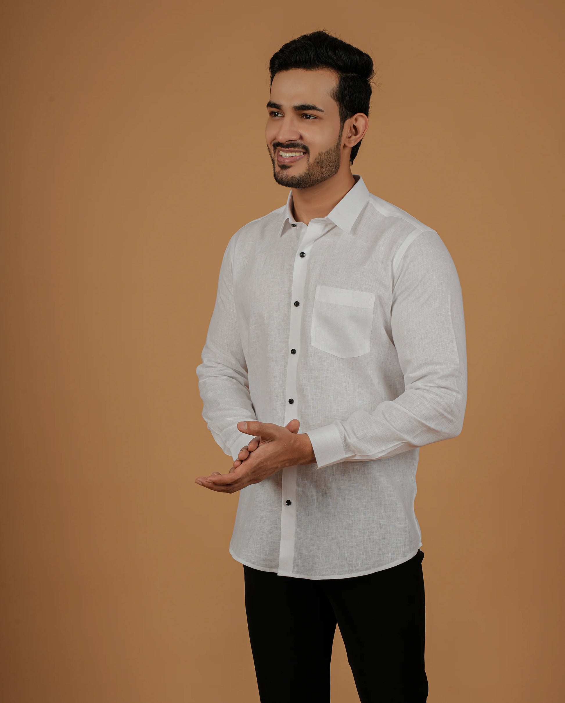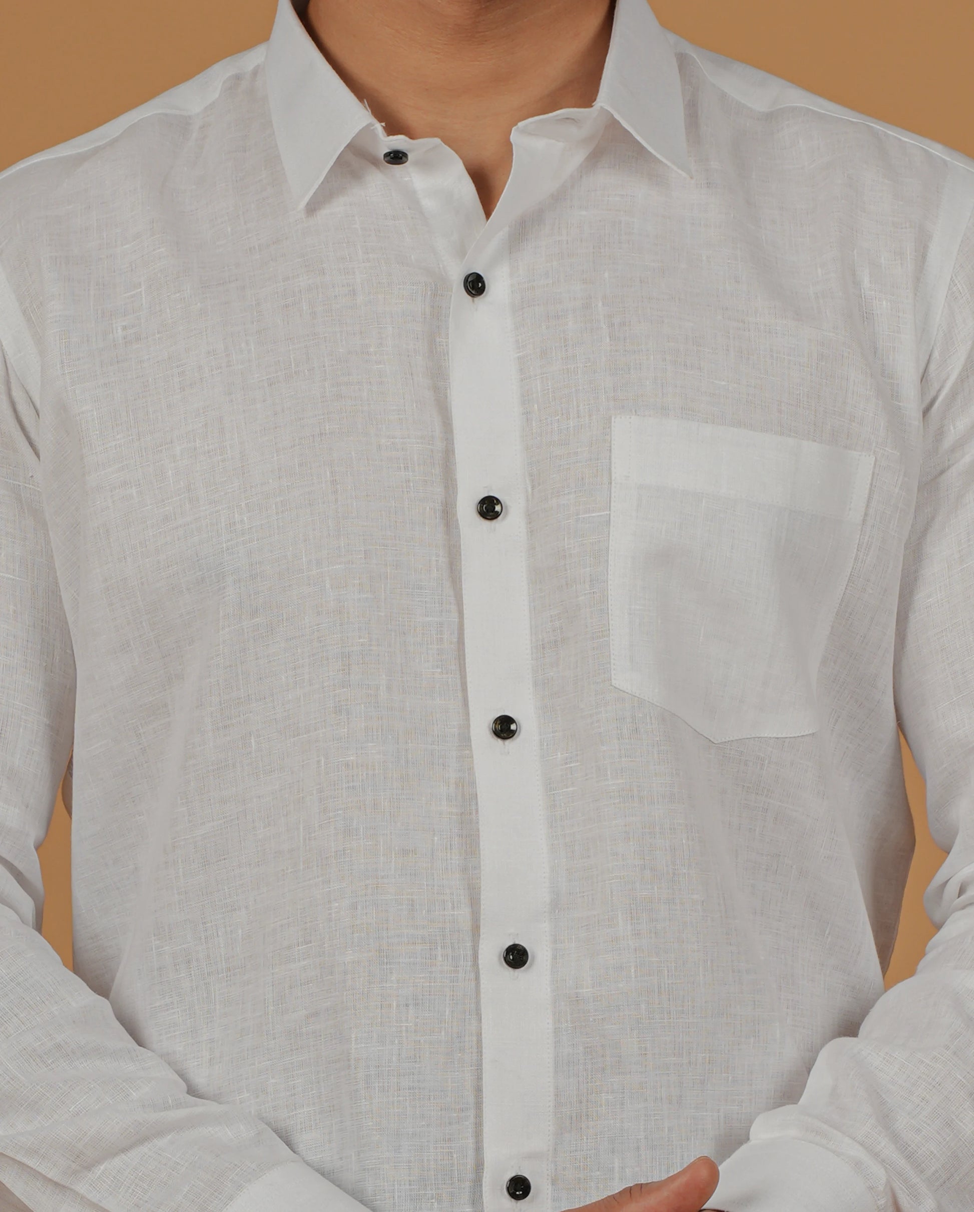 Upgrade your wardrobe with this premium white linen shirt, featuring a classic collar and stylish black buttons for a refined yet casual look. Made from lightweight and breathable linen fabric, this shirt ensures ultimate comfort, making it perfect for summer wear, casual outings, office wear, and semi-formal events.